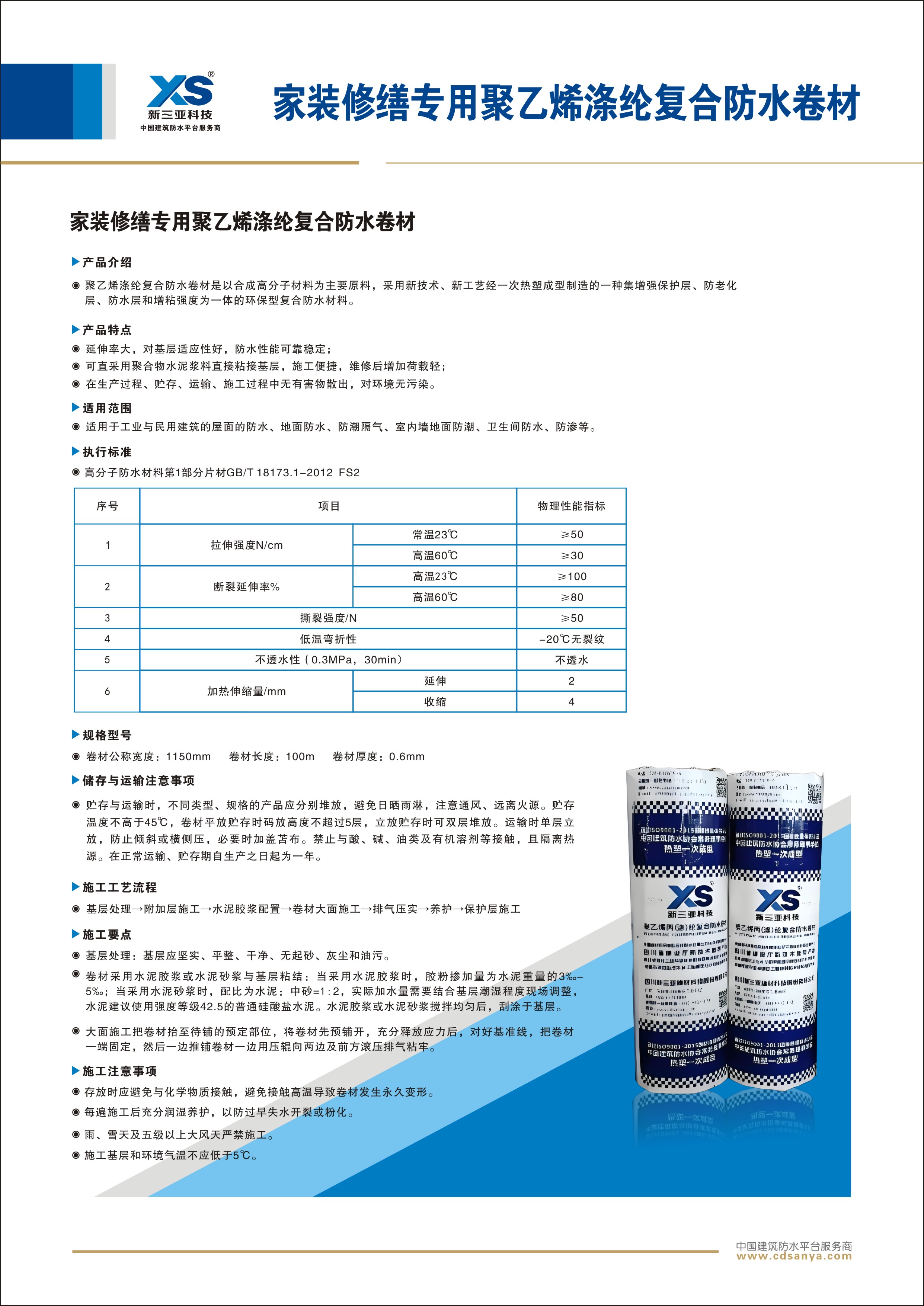 產(chǎn)品簡介: 家裝修繕專用聚乙烯滌綸復合防水卷材是以合成高分子材料為主要原料,采用新技術、新工藝經(jīng)一次熱塑成型制造的一種集增強保護層、防老化層、防水層和增粘強度為一體的環(huán)保型復合防水材料。 規(guī)格:FS2-PE-50.0m*1.15m*0.60mm |