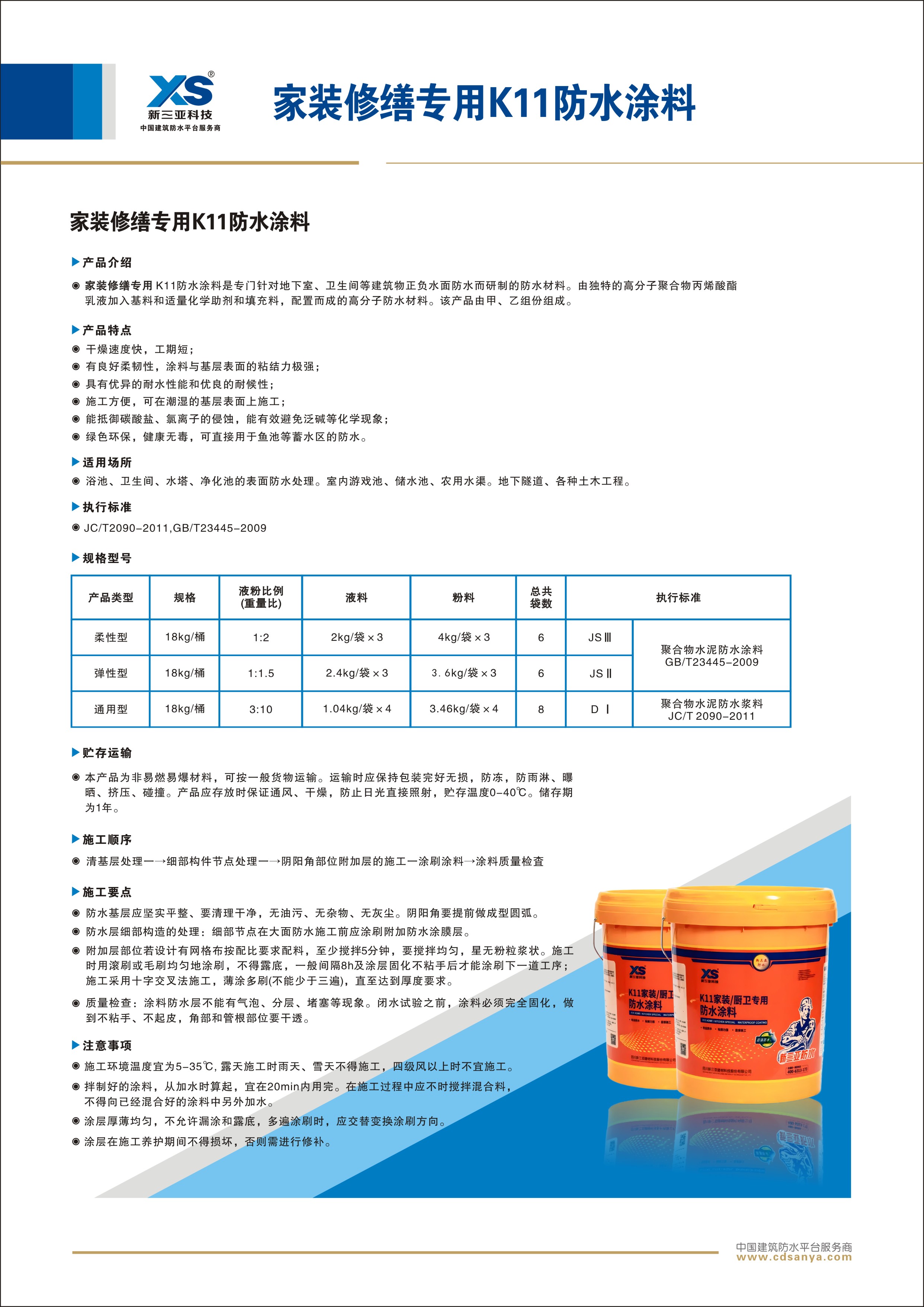 產(chǎn)品簡(jiǎn)介: 家裝修繕專用K11防水涂料是專門針對(duì)地下室、衛(wèi)生間等建筑物正負(fù)水面防水而研制的防水材料。由獨(dú)特的高分子聚合物丙烯酸酯乳液加入基料和適量化學(xué)助劑和填充料,配置而成的高分子防水材料。該產(chǎn)品由甲、乙組份組成。 規(guī)格:18kg/桶 | ![]() |